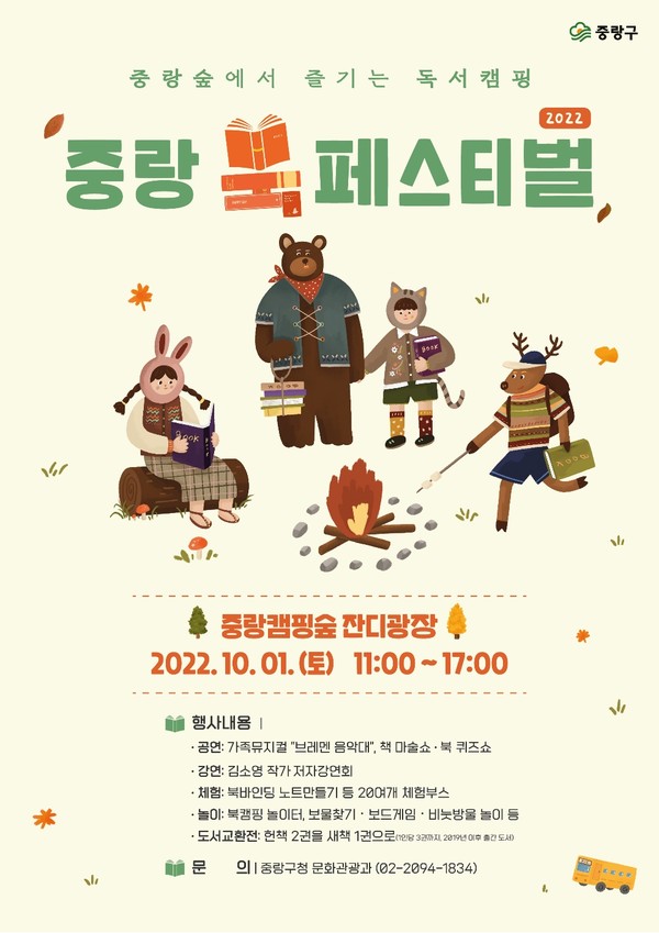 중랑북페스티벌은 문화와 독서를 사랑하는 사람들을 위한 축제입니다. 2023년 10월 21일에 중랑캠핑숲 잔디광장에서 개최될 예정입니다. 이 축제에서는 각종 체험부스, 북놀이터, 도서교환전, 마술공연, 퀴즈쇼, 북토크 등 다양한 행사가 진행될 예정입니다. 관심 있는 분들은 방문해 보시길 바랍니다.