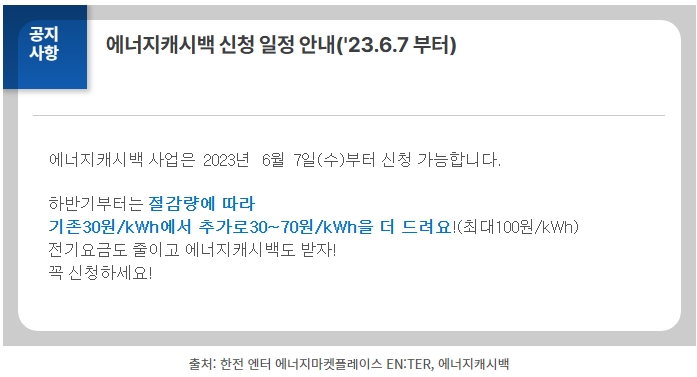 에너지 캐시백은 에너지마켓플레이스 회원가입 후에 신청 기간인 6월부터 신청할 수 있습니다.
