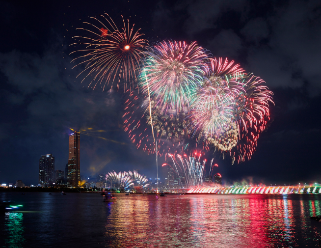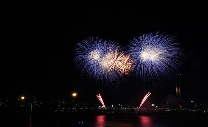 원효대교 위에서는 왼편에서는 외국팀의 불꽃쇼를 볼 수 있고, 오른쪽에서는 한국팀의 불꽃쇼를 가까이에서 감상할 수 있습니다. 원효대교는 불꽃축제 관람에 매우 적합한 장소로 알려져 있으며, 관람객들은 다리 위에서 아름다운 불꽃을 감상할 수 있습니다.
