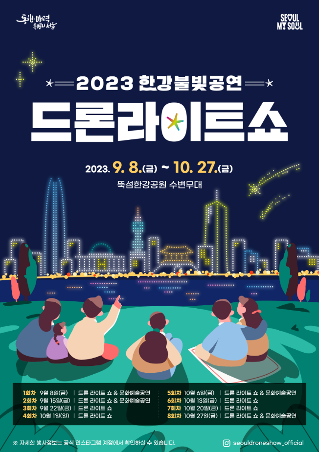 2023 한강 드론 라이트 쇼는 서울의 도심 속에서 특별한 힐링의 시간을 선사합니다. 한강을 배경으로 한 예술 공연과 1,000대의 드론을 사용한 라이트 쇼는 사랑하는 사람과 함께하는 로맨틱한 경험을 선사할 것입니다. 뚝섬한강공원에서 진행되는 이 행사를 놓치지 마세요!