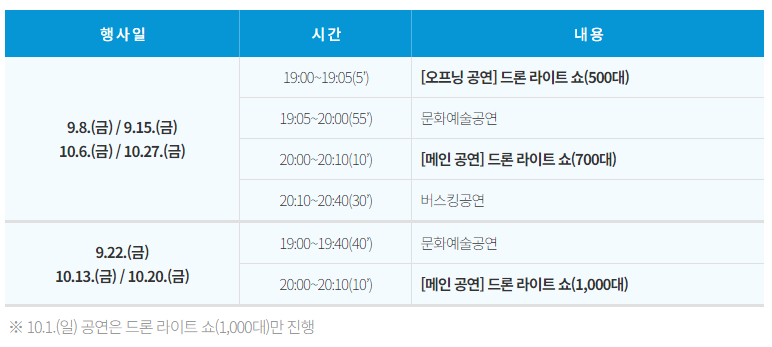 이 행사의 가장 큰 특징은 1,000대의 드론을 사용한 라이트 쇼입니다. 드론들이 서로 다른 색상의 조명을 발하며 서울의 밤하늘을 아름답게 수놓습니다. 이 아름다운 광경은 사랑하는 사람과 함께하는 로맨틱한 시간을 만들어줍니다.