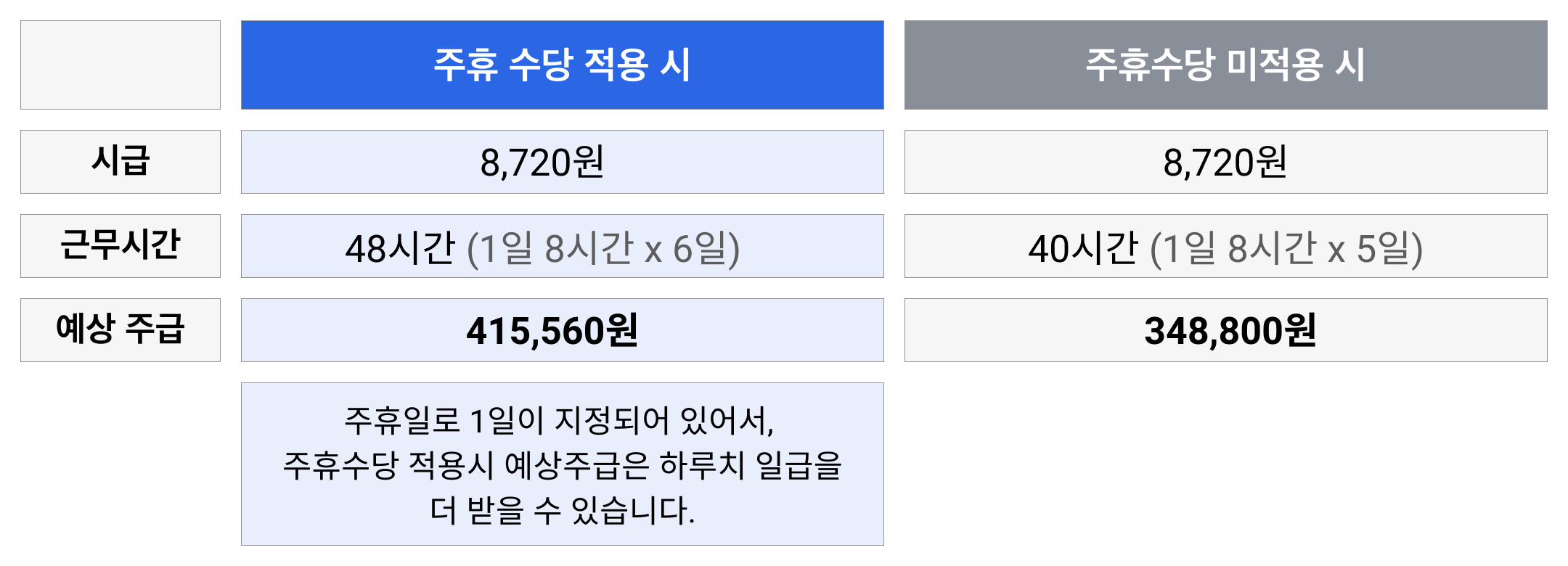 - 월급 기준 주휴수당 계산: (월급 ÷ 주당근무시간 × 4.345주) × 8시간